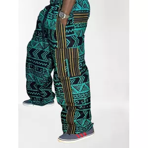 "Boogie Max Pants: Relaxed-fit, multi-pocket pants blending Ankara and Aso Oke fabrics for a utilitarian yet stylish vibe. Perfect for movement and outdoor flair, with adjustable waistbands and reinforced stitching. *Note: "Fabric design and pattern may vary due to availability but will retain the same high quality."