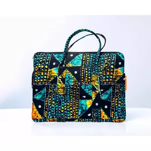 Protect your laptop in style with the Leather Flap Laptop Bag. This versatile bag features a base made from multiple Ankara prints, quilted for a unique and eye-catching finish. The calfskin leather flap closure adds a touch of sophistication and class, while the detachable leather straps allow you to carry the bag in several ways. Use the shorter straps for a classic briefcase look, or attach the longer straps to wear it crossbody. The spacious interior accommodates a 15-inch laptop and other essentials, making it the perfect travel companion. Whether you're heading to a client meeting or catching a flight, the Leather Flap Laptop Bag is sure to make a statement.