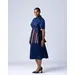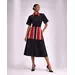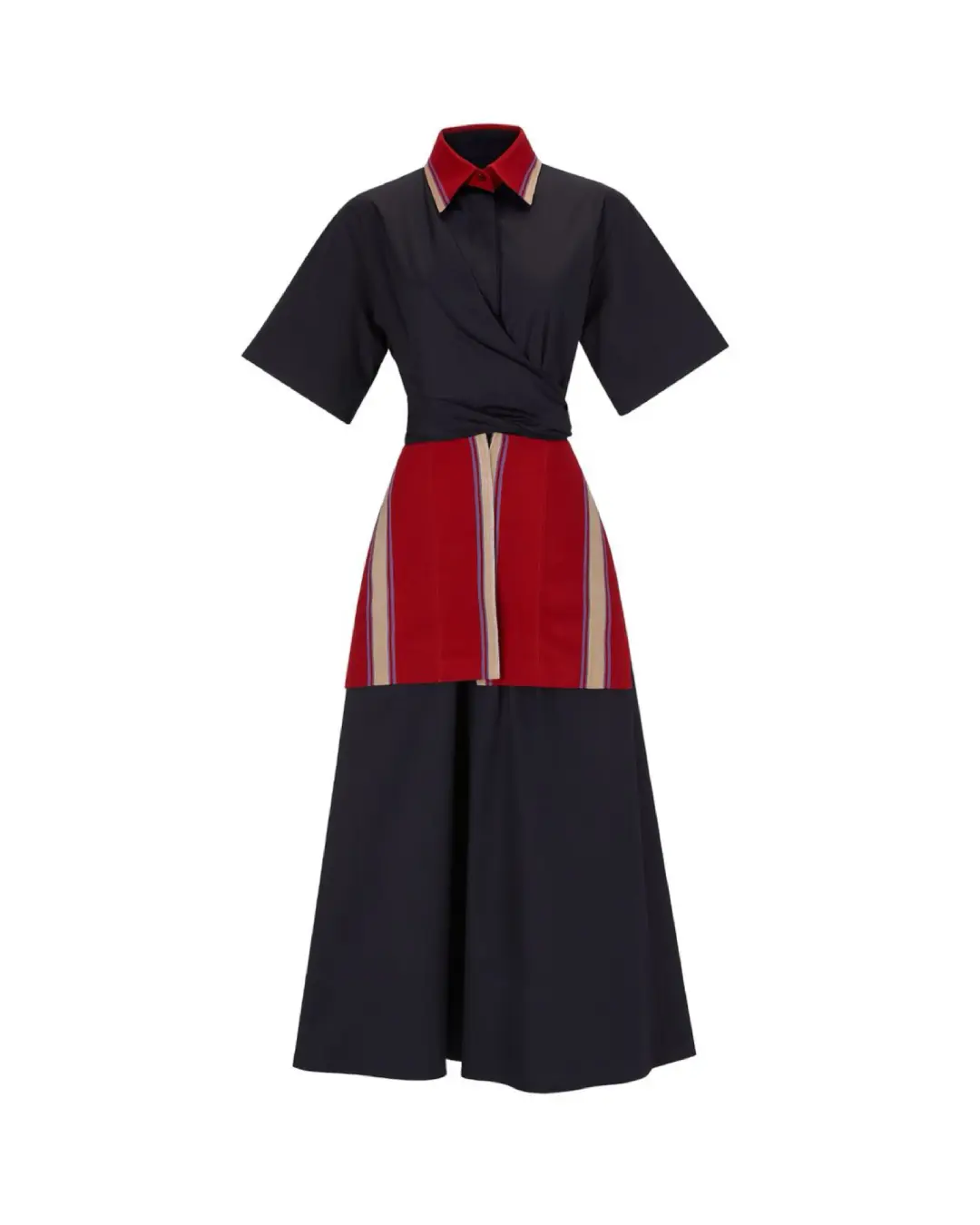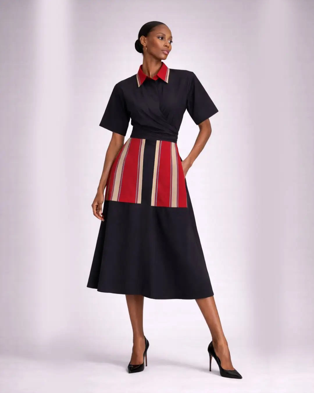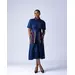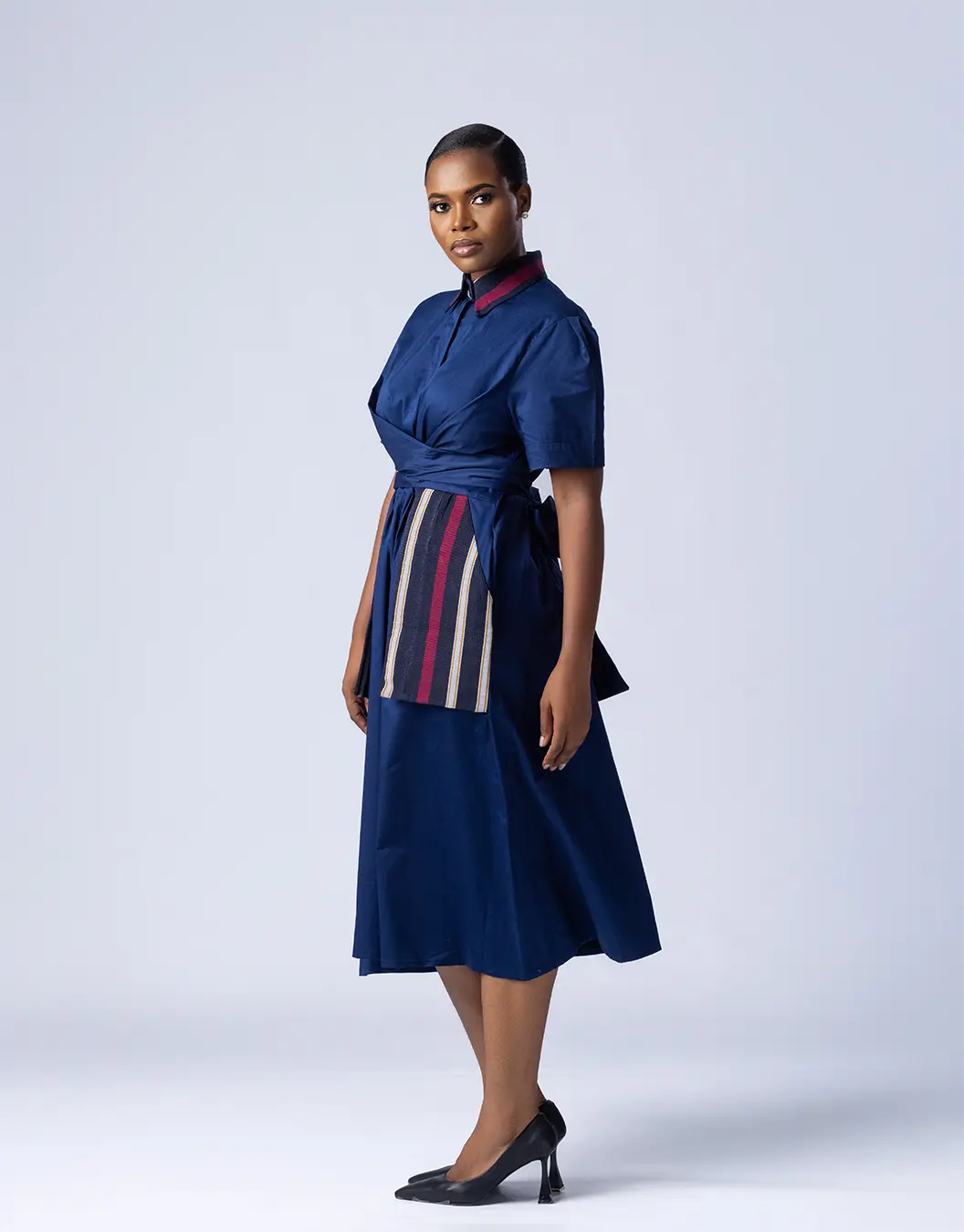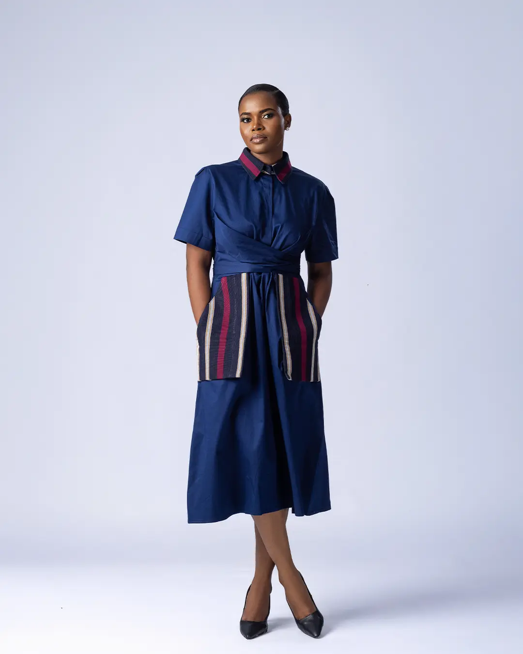 Our bestselling Oriki Dress returns with a striking new update. Crafted from rich navy polished cotton, this refined midi-length silhouette features a flattering wrap-style bodice and a structured collar for elevated edge. Signature Aso Oke inserts in vibrant red with vertical woven stripes bring bold cultural flair, while the cinched waist ensures a flattering fit. Designed to move seamlessly from day to evening, the Oriki Dress blends tradition and modernity—and yes, she’s got pockets.